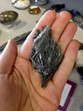 Kyanite - Grounds and aligns all energy centers during and after meditation. Good for clearing all negative thoughts and feelings. It never needs cleaning as it does not hold negative energy. Encourages you to speak your truth, cutting through fears and blockages.