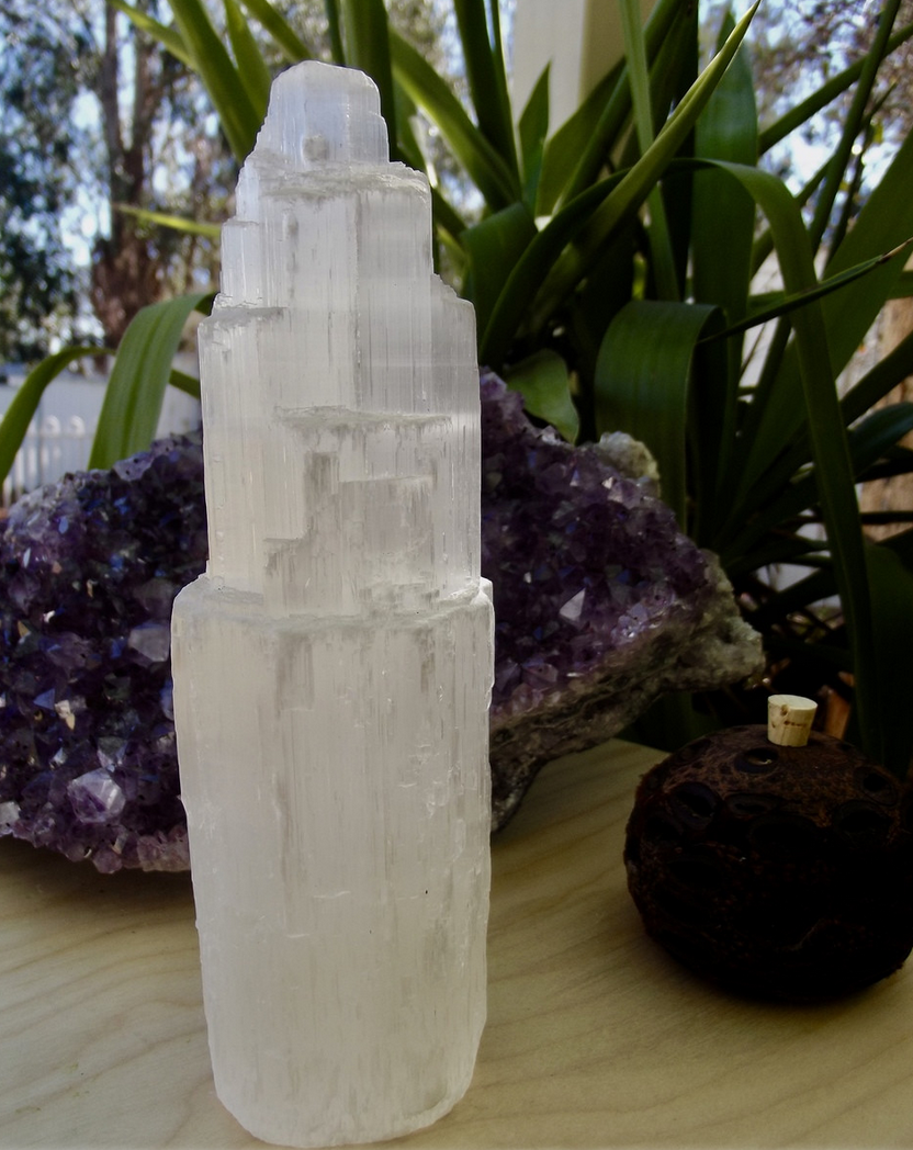 Selenite is often chosen for the bedroom because of its light, peaceful, cleansing presence. Many people use it to help create a calm, clear energy in the room especially if the space feels busy, stagnant, or energetically cluttered.